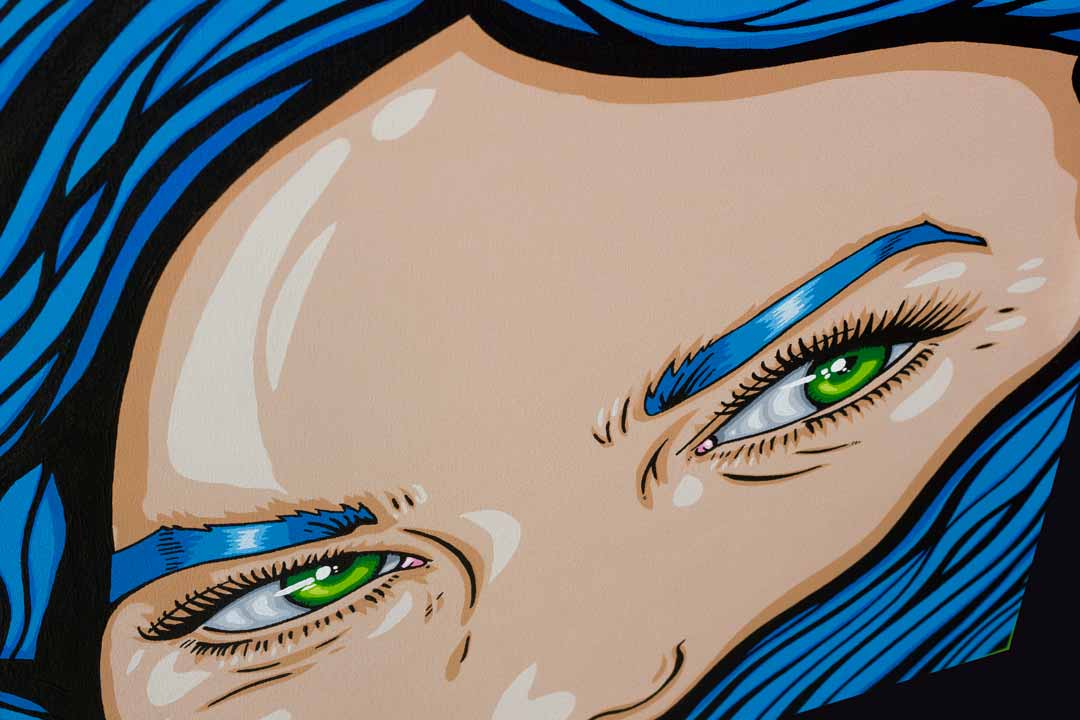 I use bold colour, sharp contrast, and comic-inspired elements to amplify emotion. The glowing green eye and vivid blue hair create a visually striking pop art portrait, trying to blending street art influence with contemporary portraiture.