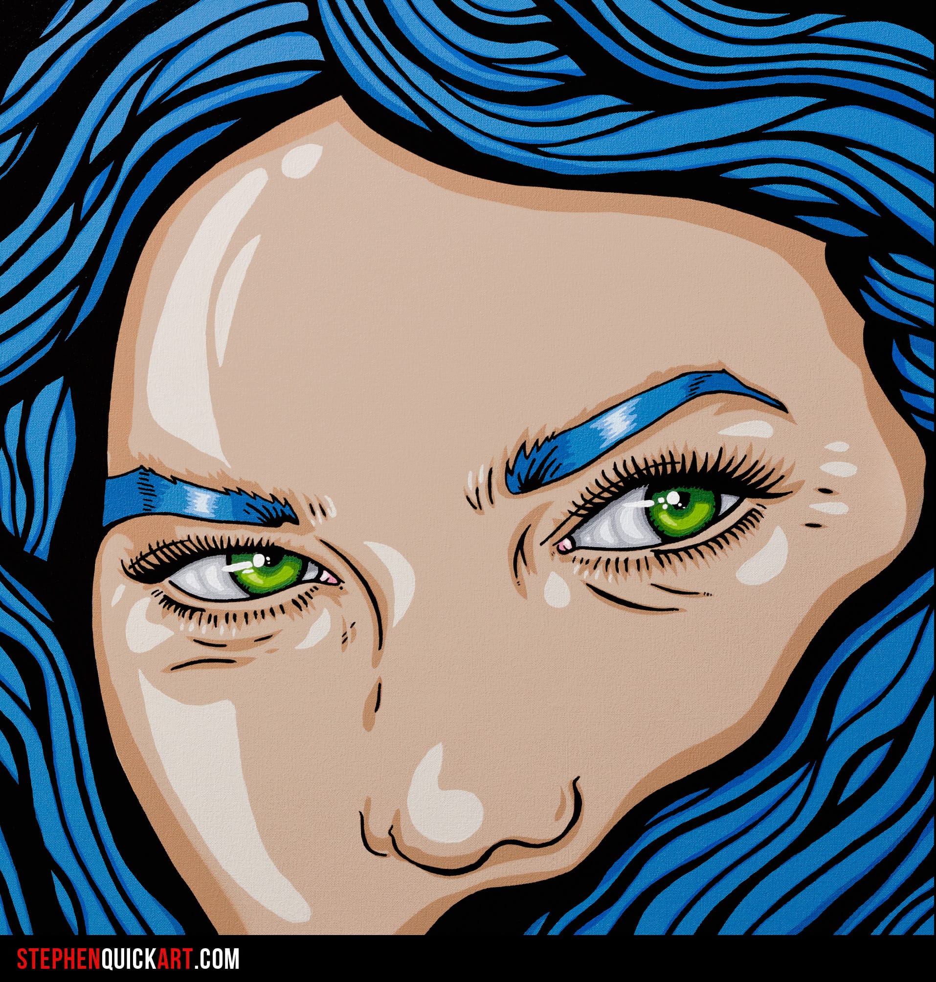 Feminist Pop Art Painting. Acrylic on Canvas. I created this original feminist pop art painting in acrylic on canvas as a bold exploration of female empowerment and emotional honesty. The piece focuses on a striking close-up portrait, an intense green eyes set against flowing blue hair—staring directly out at the viewer with anger, defiance, and control.